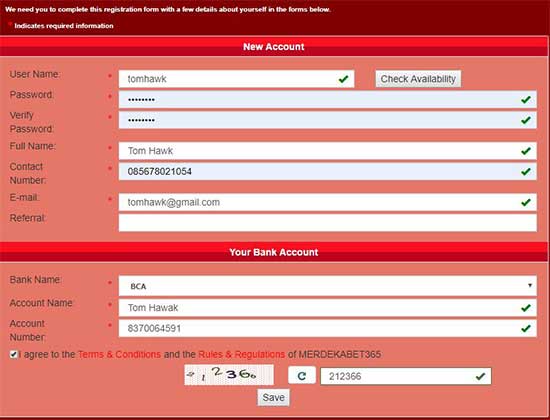 - Jika Anda sudah mengisi setiap kolom yang tersedia pada Form Pendaftaran Merdekabet365 dengan lengkap dan benar, klik tombol “Save”.